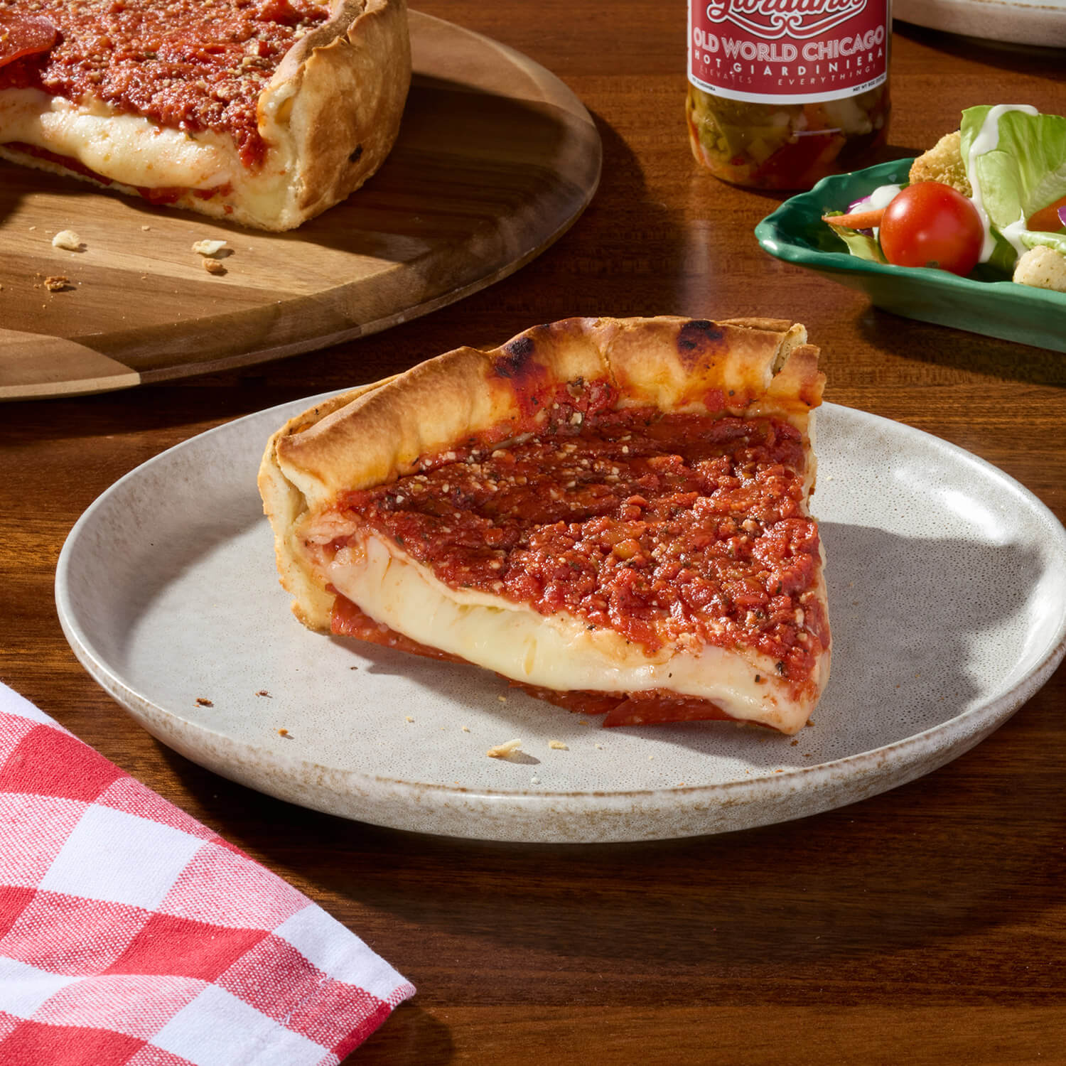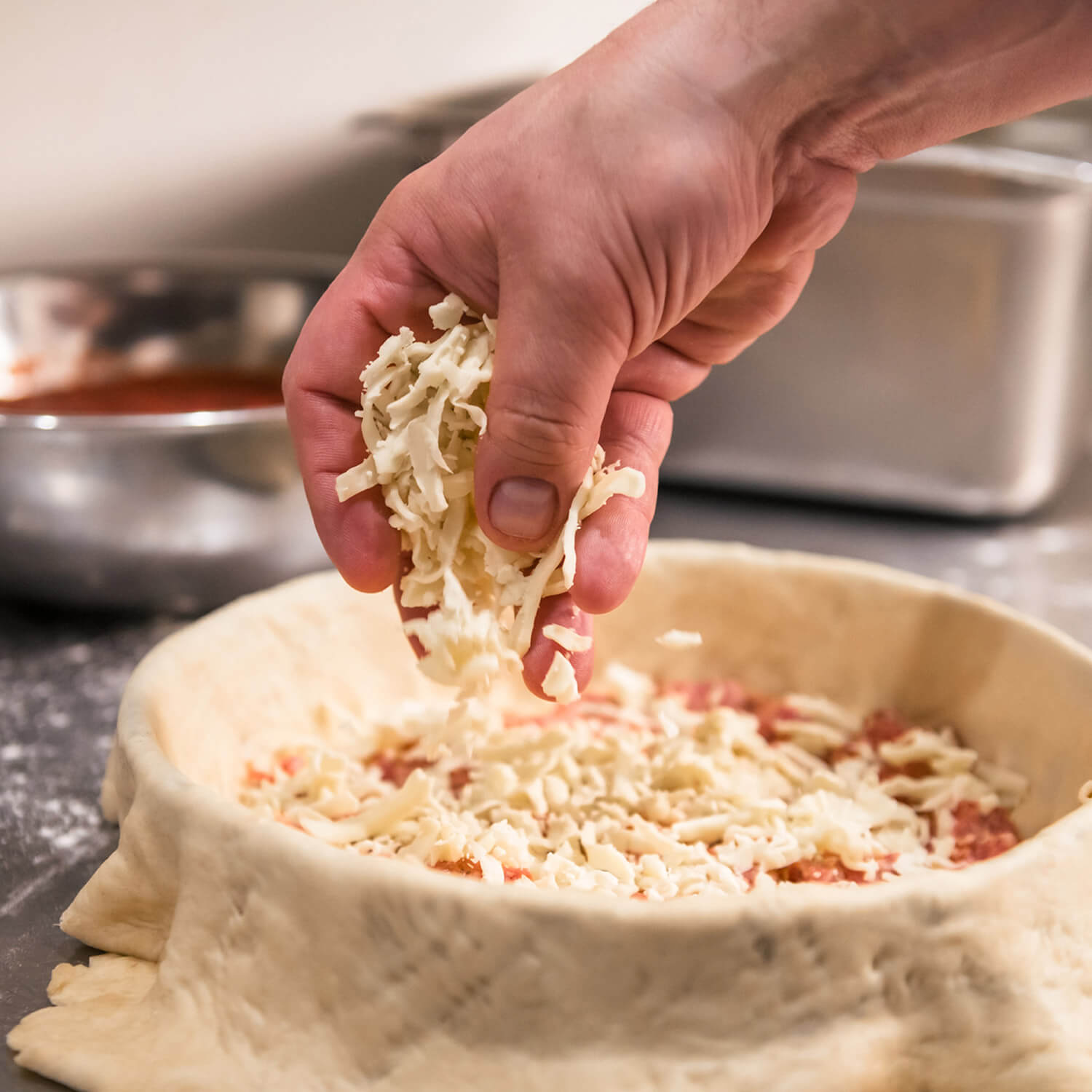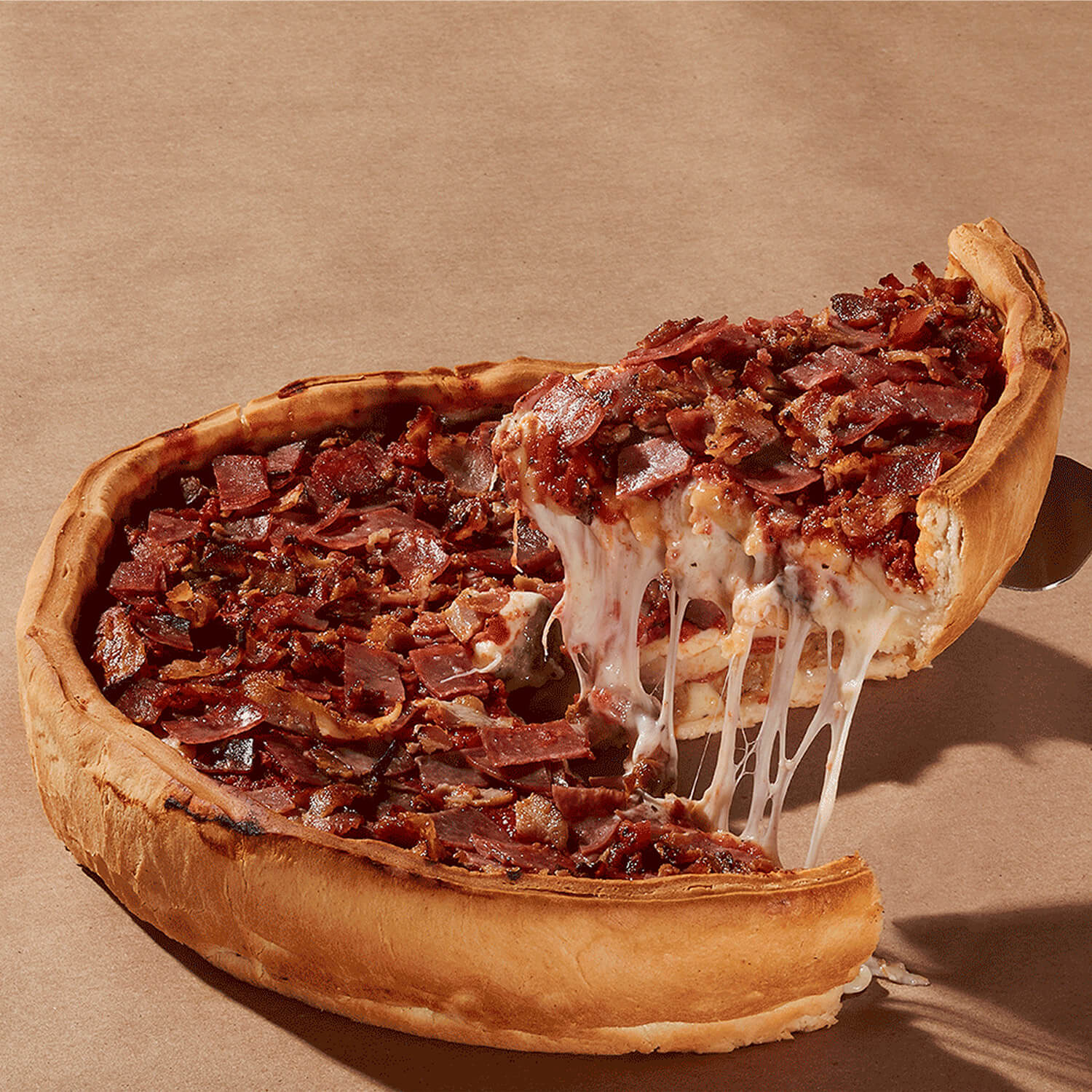 We use more ingredients than other Chicago deep dish pizzas, including nearly a pound of mozzarella cheese in every pie. We make every batch of sauce ourselves using our secret recipe and vine-ripened tomatoes from Northern California. Our pepperoni is extra thick and half beef, and our sausage is made with an in-house recipe and no nitrates.